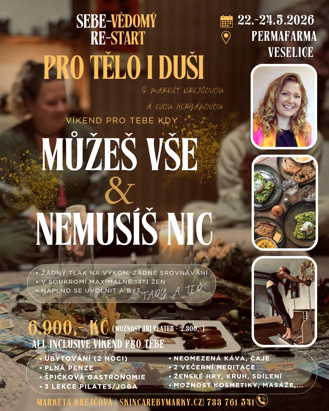 Buď součástí něčeho většího. Dovol sama sobě povolit tlak a dopřej si 2 noci v kruhu ostatních žen. Víkend pro ženy v krásném prostředí Permafarmy Veselice plný dobrého jídla, meditace a pilates / jogy. Sdílení mezi ženami, kosmetika… Dva dny pro tvou duši i tělo.