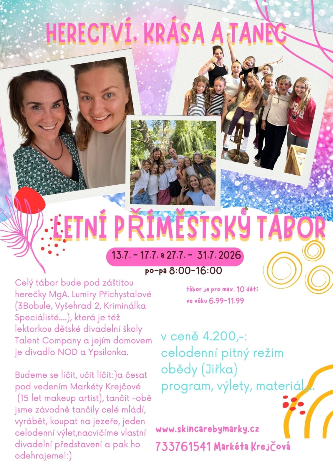 Do tohoto vymazleného pipi projektu jsme daly všechno — své srdce a nekonečno nadšení. Společně s mou kamarádkou Lumčou (herečka Lumíra Přichystalová) jsme se rozhodly zorganizovat unikátní příměstský tábor, kde se plně respektují potřeby holčiček: vášeň k make-upu, lakování nehtů, účesům, třpytkám, láska k tanci, divadlu, smíchu a hlavně kruhu přátelství. Chápeme, že někdy je potřeba více než 4krát za den změnit barvu laku na nehty, aby ladila s třpytivým lookem!